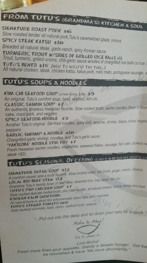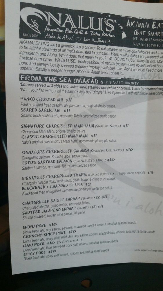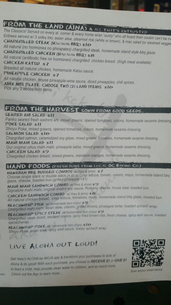 Nalu’s Hawaiian Fish Grill offers a diverse menu with options for seafood lovers, meat enthusiasts, and vegetarians alike. Located in Foothill Ranch, CA, this restaurant provides delivery, takeout, and catering services, making it convenient for patrons. The Hawaiian-inspired dishes, such as Panko Crusted Ahi and Seared Garlic Ahi, showcase the fresh flavors of the sea. Noteworthy options from the land include Chargrilled Steak with Island-style BBQ glaze and Chicken Katsu with homemade sauce. The restaurant also offers refreshing salads like Seared Ahi Salad and Poke Salad with homemade sesame dressing. Customers praise the quality of the food, clean atmosphere, and friendly staff. Overall, Nalu’s Hawaiian Fish Grill embodies the essence of Hawaiian cuisine with a modern twist, making it a hidden gem for seafood enthusiasts.